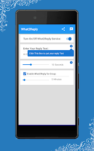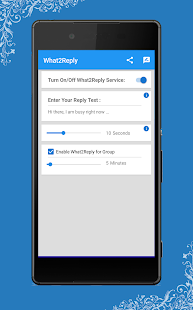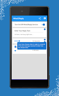 Auto-reply WhatsReply sends a predefined message to each contact that writes to you in automatized fashion and does it automatically when you are busy.